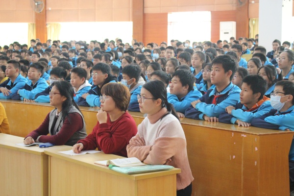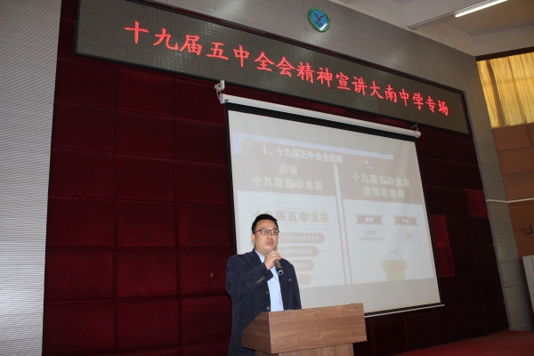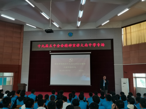 為了深入學(xué)習(xí)貫徹黨的十九屆五中全會(huì)精神,加強(qiáng)對(duì)學(xué)生的愛(ài)黨愛(ài)國(guó)教育,培養(yǎng)合格的社會(huì)主義建設(shè)者和接班人,2020年12月8日上午,港口鎮(zhèn)大南中學(xué)在一樓階梯教室舉行了十九屆五中全會(huì)精神宣講報(bào)告會(huì)。本次宣講會(huì)由市宣講員、大南中學(xué)德育處副主任周智勇主講,宣講的題目為《領(lǐng)會(huì)會(huì)議精神 筑夢(mèng) 鑄夢(mèng)》。