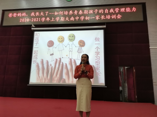 孩子人生的每一個一帆風(fēng)順,每一個柳暗花明,每一個峰回路轉(zhuǎn),都離不開學(xué)校、家長的共同努力,通力合作。為進一步加強家校聯(lián)系,增進家長對學(xué)校工作的了解,提高家庭教育的觀念,真正達到家校攜手,共同培養(yǎng)孩子的目的,2020年11月11日晚,港口鎮(zhèn)大南中學(xué)在一樓階梯室召開主題為《如何培養(yǎng)青春期孩子的自我管理能力》的家庭教育培訓(xùn)會。會議由副校長廖建紅主持。