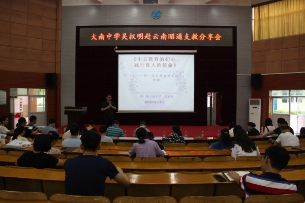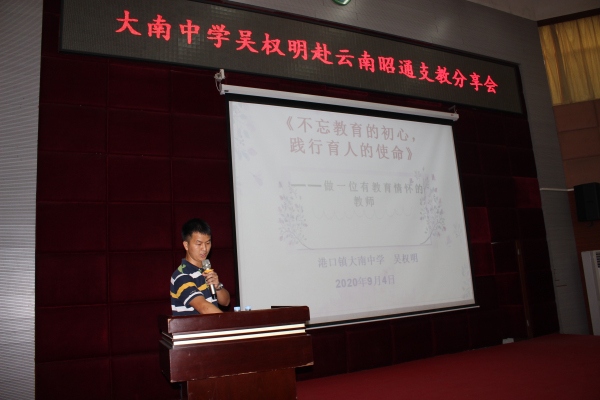 2020年9月4日下午,大南中學(xué)吳權(quán)明赴云南昭通支教分享會(huì)在一樓階梯室舉行,港口鎮(zhèn)黨委委員羅希京、港口鎮(zhèn)教育事務(wù)指導(dǎo)中心教研專干蘇少偉、大南中學(xué)70余位老師參加了此次分享會(huì)。