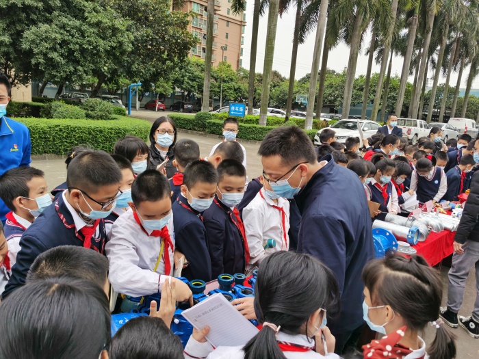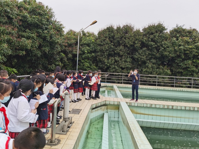 下午兩點(diǎn)半,四年級學(xué)生已經(jīng)排著整齊的隊(duì)伍出發(fā)古鎮(zhèn)供水廠。一來到水廠,各位工作人員對同學(xué)們的到來表示熱烈歡迎。他們先對古鎮(zhèn)供水廠作了簡單介紹;接著,同學(xué)們在工作人員的帶領(lǐng)下參觀了供水廠的沉淀池、過濾池、清水池等不同地方;同時(shí),水廠工作人員也詳細(xì)地為同學(xué)們講解了原水是怎樣經(jīng)過混合、反應(yīng)絮凝、沉淀、過濾、消毒等環(huán)節(jié),才變成我們家家戶戶所用的干凈、健康的自來水。同學(xué)們都聽得非常認(rèn)真,還不時(shí)禮貌地請教工作人員各種關(guān)于自來水凈化工藝流程的問題,并做好筆記。同學(xué)們還認(rèn)真地觀看了工作人員進(jìn)行余氧檢測的操作,了解了如何通過微生物實(shí)驗(yàn)以及滴定實(shí)驗(yàn)來測定水的潔凈程度,深切體驗(yàn)了自來水生產(chǎn)過程的科學(xué)性與嚴(yán)謹(jǐn)性。