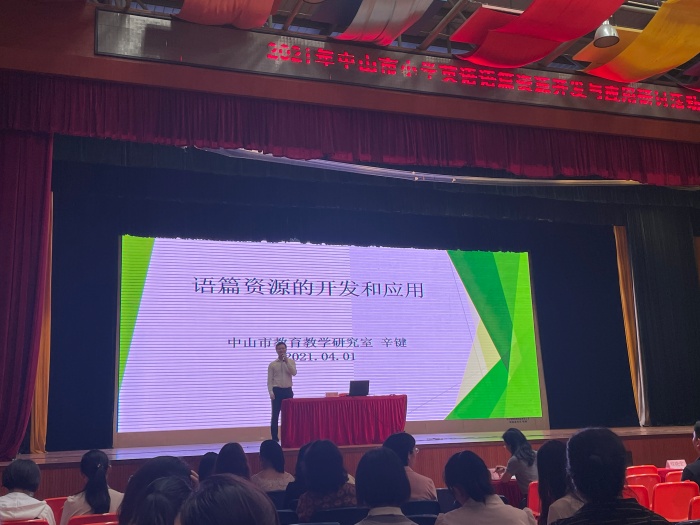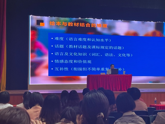 然后,程教授帶來了“英語教學(xué)中拓展語篇資源的開發(fā)與利用”為題的講座。程教師從為什么要開發(fā)和利用拓展語篇教學(xué)、拓展教學(xué)資源的定義、跨教材資源的優(yōu)勢、小學(xué)開展繪本教學(xué)的意義等方面向大家闡述了在英語教學(xué)中拓展語篇的開發(fā)與利用的作用以及優(yōu)勢。最后,中山市小學(xué)英語教研員辛建老師也就語篇資源的開發(fā)和應(yīng)用的背景和開發(fā)原則方面進行了簡單的闡述。