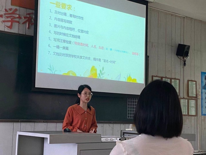 最后由曹一小學副校長陳美方進行新學期的學校宣傳工作培訓,以提高學校宣傳工作的水平和質量。她首先對鎮(zhèn)宣傳工作程序的流程進行了說明,讓宣傳組員對稿件的修改與審核有清晰地了解,對以往的優(yōu)秀文章進行解讀和品味,并傳授自己學習撰稿的小妙招:“對優(yōu)秀稿件進行仔細揣摩和學習?!背酥?,她還對寫稿的流程和格式進行了系統(tǒng)規(guī)范的講解,讓宣傳組組員對撰稿有了更深的領悟和體會。