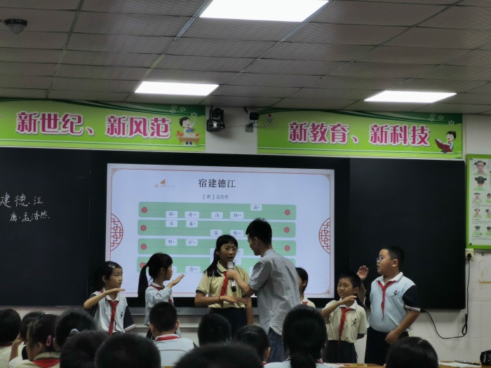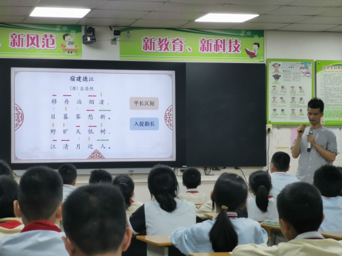 活動伊始,由巫勇華老師執(zhí)教一節(jié)古詩吟誦教學(xué)課。巫老師將《宿建德江》這首詩中的意象繪制成了一幅充滿意境的畫卷,帶領(lǐng)孩子們走進(jìn)古詩,品味詩文,感悟詩文之美。本課最大亮點(diǎn)是能采用聲韻分析的方法,教會學(xué)生在吟誦中引導(dǎo)學(xué)生理解古詩,并抓住“舟”、“日暮”、“月”等字,從意象的角度分析這些字的深刻涵義,讓學(xué)生們體會到關(guān)鍵字詞的理解能在古典詩文中領(lǐng)悟古詩的文化背景。