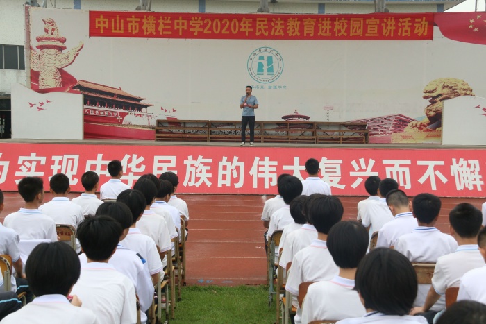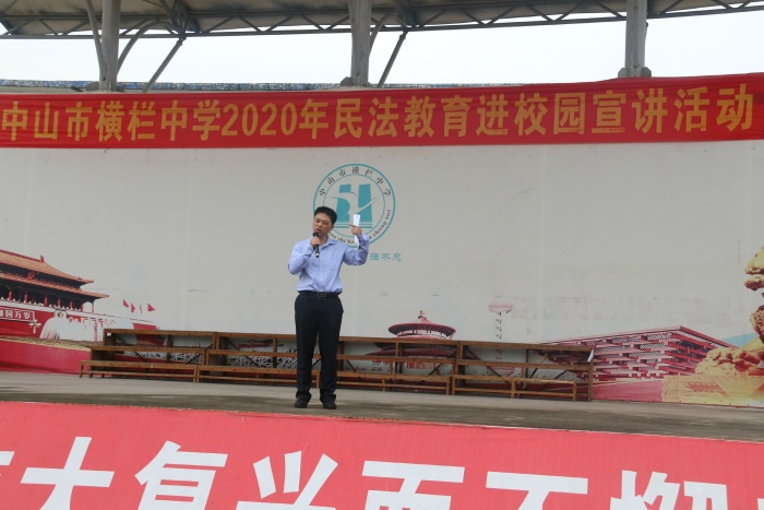 為營(yíng)造濃厚的《民法典》普法學(xué)習(xí)氛圍,弘揚(yáng)法治精神,2020年10月13日,中山市橫欄中學(xué)誠(chéng)邀廣東雅山律師事務(wù)所陳經(jīng)文律師來到學(xué)校,為橫欄中學(xué)全體同學(xué)開展《民法典》普法宣講活動(dòng)?;顒?dòng)由學(xué)校德育處羅錫坤主任主持。