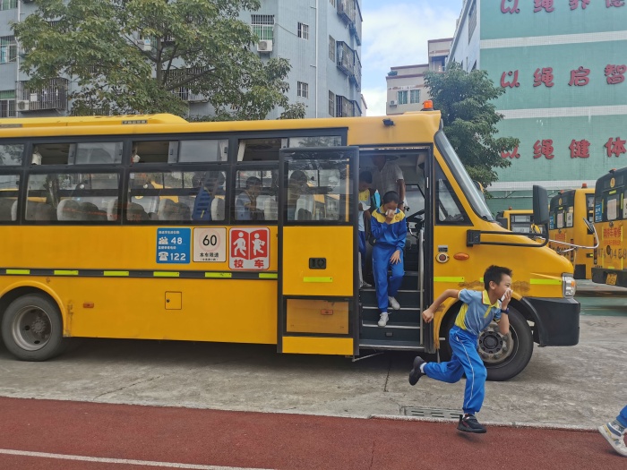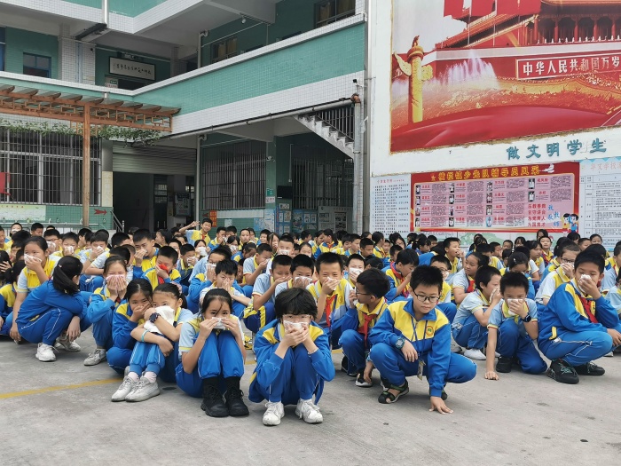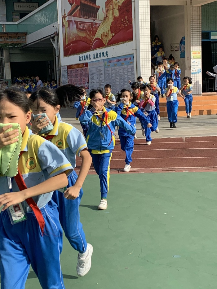 9時整,隨著一陣尖銳而又急促的火警警報聲響起,各班在班主任或科任老師指揮下,緊急進入警備狀態(tài)。孩子們迅速排好隊,從教室往樓梯口撤退。他們緊貼著墻壁或樓梯欄桿,右手用毛巾捂住口鼻,彎腰、有序、安全地向前小跑,全校師生毫不慌亂,安排人員各自盡職守護崗位,指揮并搜索有無未撤出的孩子。全校2700余師生在4分鐘之內(nèi)按預(yù)定的疏散路線安全撤離到指定地點。接著,學(xué)校還模擬了校車突發(fā)火災(zāi)后的應(yīng)急逃生演練,校車上的同學(xué)在跟車?yán)蠋煹闹笓]下安全、有序、快速地撤離到安全地方等候進一步處理。