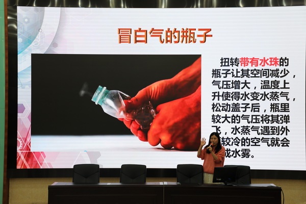 接著,該校的科學(xué)專職教師柳樺給同學(xué)們帶來(lái)了互動(dòng)游戲——《瓶里吹氣球》。現(xiàn)場(chǎng)學(xué)生嘗試在不同大小的瓶子里吹氣球,高年級(jí)的同學(xué)鼓足了勁,臉蛋憋得通紅都沒(méi)能將氣球吹脹起來(lái)。柳老師借機(jī)換了一個(gè)帶孔的瓶子,再邀請(qǐng)低年段的學(xué)生參與,低年級(jí)學(xué)生輕而易舉地就把氣球吹脹起來(lái),現(xiàn)場(chǎng)學(xué)生熱烈歡呼,觀看視頻直播的孩子們更是倍感神奇。趁著孩子們的激情高漲時(shí)刻,柳老師又給同學(xué)們播放了一段精彩的“氣壓實(shí)驗(yàn)”視頻,最后又給同學(xué)們現(xiàn)場(chǎng)體驗(yàn)了“讓針筒里的水重新沸騰”的實(shí)驗(yàn)。學(xué)生在實(shí)驗(yàn)中感受到了神奇的科學(xué)就在身邊。