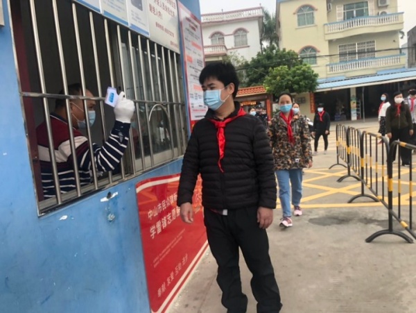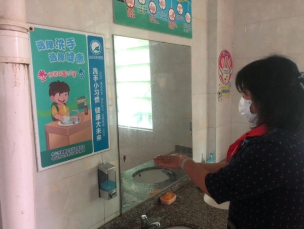 演練堅持“演練即是實戰(zhàn)”的要求,落實落細(xì)各項措施。陸銳勛校長為本次演練的總指揮。本次演練分為7個場景。場景一:排隊進入校門。24個班主任扮演學(xué)生,分2路縱隊從刷卡口進入。場景二:監(jiān)測體溫,學(xué)生排成2路縱隊,馮培有、吳宇恒、負(fù)責(zé)測量學(xué)生體溫,體溫正常方可入校。學(xué)生間隔1米排隊依次接受檢測;體溫正常者直接回教室,不要停留。假如發(fā)現(xiàn)有學(xué)生出現(xiàn)發(fā)燒癥狀(體溫37.3℃)值日行政馬上請她到臨時觀察室休息,通知該班主任打電話叫家長把孩子送到民眾醫(yī)院發(fā)燒門診部就診。場景三:課室上課,學(xué)生到班后,班主任對學(xué)生詢問“三史”,確認(rèn)無異常后,前往課室準(zhǔn)備上課。在上課期間發(fā)現(xiàn)學(xué)生提出身體不適,經(jīng)簡單詢問和測量體溫,如有發(fā)燒立刻打電話給梁兆元,曾國恒帶學(xué)生離開課室,到臨時觀察室。對全班學(xué)生逐一進行體溫檢測,確認(rèn)均無異常后,由上課老師帶領(lǐng)學(xué)生由疏散專用通道離開,到備用課室上課。梁兆元通知消毒員對課室周邊及專用通道進行消毒處理。場景四:臨時觀察室,吳文興由專門通道將身體不適的學(xué)生帶到臨時觀察區(qū),用水銀溫度計進行腋下測量該生體溫,發(fā)現(xiàn)確實偏高,立刻致電班主任并由班主任聯(lián)系家長在校門口等候,接該學(xué)生前往民眾醫(yī)院看病。假如學(xué)生有嘔吐,由曾國恒老師處理嘔吐物。梁兆元通知消毒員對臨時觀察區(qū)進行消毒處理。場景五:學(xué)習(xí) “七步洗手法”,1、所有班主任回教室坐好,由張容冰教大家學(xué)習(xí)“七步洗手法”。2、所有班主任扮演學(xué)生上廁所后洗手。場景六:學(xué)生上下樓梯,學(xué)生靠兩邊有序上下樓梯,間隔1米,后面的同學(xué)排隊,間隔1米。場景七:學(xué)生上體育課,1、學(xué)生分批在教室門前排兩路縱隊,間隔4塊地板磚,整理好隊伍后有序的向運動場走去,接著第2批。