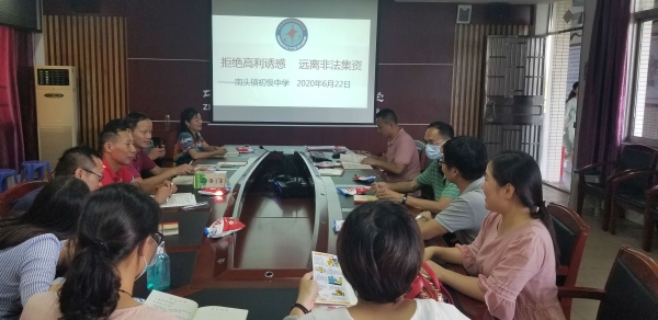 首先,由德育處宋維華主任、年級劉公寬主任面向教師主持召開防范非法集資專題宣傳培訓(xùn),使廣大教師充分認識到非法集資這種違法行為,不僅破壞正常的經(jīng)濟金融秩序,而且直接危害人民群眾利益和社會穩(wěn)定,具有嚴重的社會危害性。強調(diào)作為一名人民教師,要從思想上培育理性投資、風險自擔的正確理念,行動上自覺遠離和抵制非法集資,在全校范圍內(nèi)營造抵制非法集資的濃厚氛圍。
