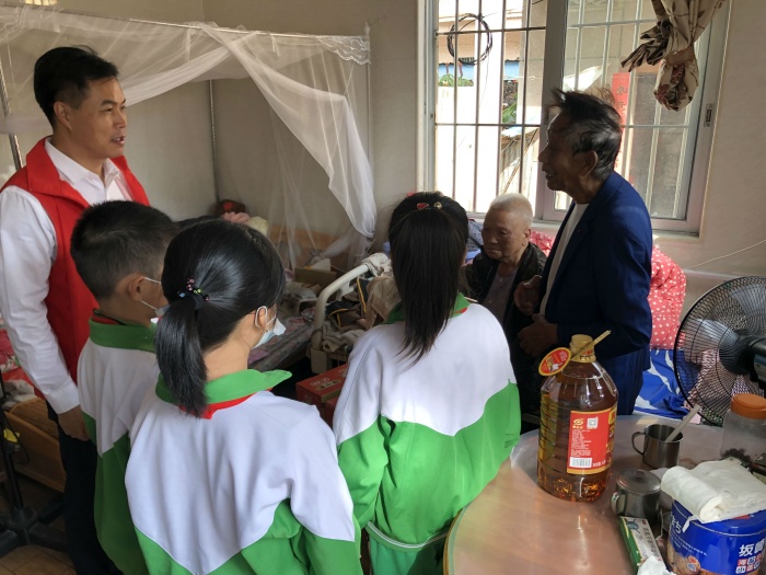 隨后在學校少先隊大隊部的組織下,結民村團支部書記吳飛寶、結民村民政助理楊順昌、學校吳博事校長、段美娟副校長和大隊輔導員周文彪老師,帶領少先隊志愿者們,走進了老人的家開展了愛心慰問活動?;顒又懈髦嘘犐傧汝犞驹刚叽頍崆榈嘏c爺爺奶奶們交談,給他們送上了面條、花生油和慰問金,并祝愿他們健康長壽。爺爺奶奶們一個個神采奕奕,高興不已,臉上露出了幸福的笑容?;顒釉谟淇斓臍夥罩许樌Y束。