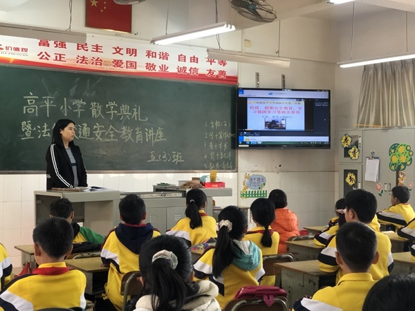 此次散學(xué)典禮,由高平小學(xué)德育處黃潔玉副主任主持。典禮在莊嚴(yán)而肅穆的升旗儀式中拉開序幕。為提高學(xué)生假期的法制、交通安全防范意識,高平小學(xué)法制副校長關(guān)松堅同志作法制知識講座,劉校長結(jié)合形象生動的實例,深入淺出地為同學(xué)們傳授法制安全小常識,提醒同學(xué)們要提高法制意識,學(xué)會用法律保護自己,做知法懂法守法的小公民,與法同行,防微杜漸。然后,三角鎮(zhèn)交警大隊杜友明警官作交通安全宣傳講座。馮警官用通俗易懂的話語和典型的事故案例,為學(xué)生敲響警鐘,提醒他們始終將交通安全牢記于心,實踐于行,切實提高防范意識,杜絕交通事故的發(fā)生。