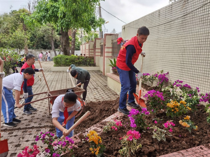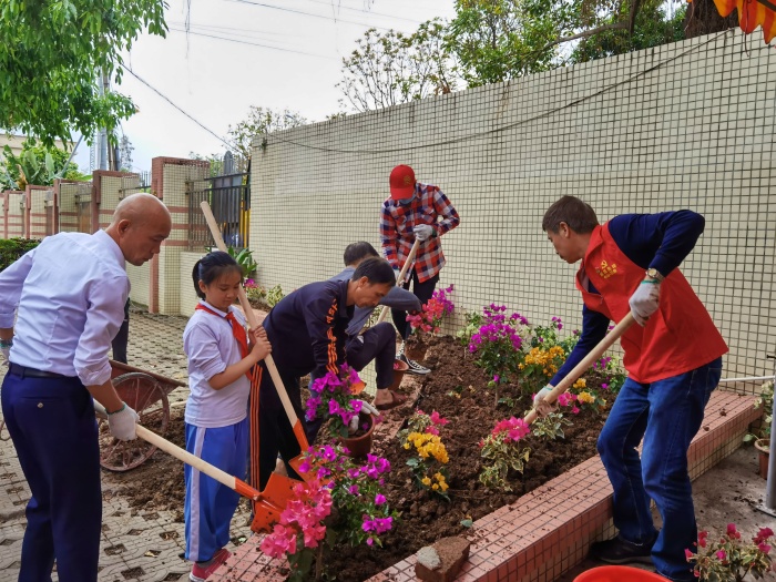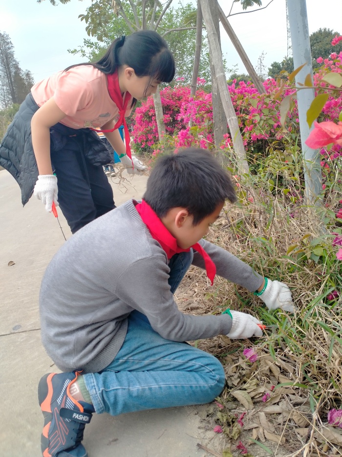學校聯(lián)合光明村關(guān)工委、少工委開展種植三角梅和校內(nèi)外環(huán)境整治活動。種植活動中,同學們在老師的帶領(lǐng)下與村關(guān)工委、少工委的爺爺、奶奶們一起,秩序井然的排隊領(lǐng)取勞動工具和花苗,高高興興來到指定的種植區(qū)域,你挖坑,我埋土,他澆水,大家分工明確、互幫互助,氣氛活躍,80棵三角梅眨眼工夫就種完了。環(huán)境整治活動中,孩子們紛紛提起掃帚、拿起鏟子、擼起袖子,對學校及周邊的衛(wèi)生死角進行統(tǒng)一清理,經(jīng)過近一小時的努力,校內(nèi)外環(huán)境煥然一新。