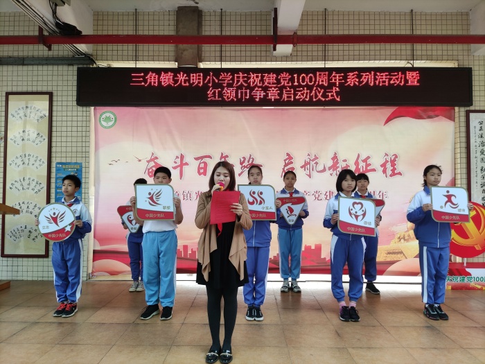 三角鎮(zhèn)光明小學慶祝中國共產(chǎn)黨建黨100周年暨紅領巾爭章活動啟動儀式發(fā)布時間:2021-03-11 10:07 信息來源:本網(wǎng)站 瀏覽次數(shù):0