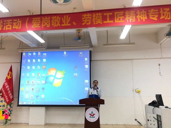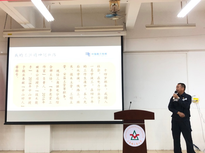 接下來(lái),中山市三角鎮(zhèn)供電分局綜合部李亮棠主任同樣為同學(xué)們帶來(lái)了精彩的宣講——《我的工匠精神》。李亮棠主任作為土生土長(zhǎng)的三角人,在參加工作以來(lái)不斷實(shí)踐,不斷創(chuàng)新,開啟了另一片廣闊的天空,在2018年被評(píng)為“中山好人”。他是群眾口中親切的“棠哥”,是電氣領(lǐng)域出色的“安全衛(wèi)士”。以李主任為首的創(chuàng)新工作室經(jīng)過(guò)多年研究,發(fā)明了多項(xiàng)創(chuàng)新成果并成功申請(qǐng)了多項(xiàng)國(guó)家專利。李亮棠主任將這些成就都?xì)w功于“工匠精神”,他表示:工匠精神是一種職業(yè)精神,它是職業(yè)道德、職業(yè)能力、職業(yè)品質(zhì)的體現(xiàn),其內(nèi)涵包括敬業(yè)、精益、專注、創(chuàng)新等方面的內(nèi)容。自己也不斷要求自己貫徹習(xí)近平總書記關(guān)于雷鋒精神中“要不斷發(fā)揚(yáng)干一行愛一行,專一行精一行的敬業(yè)精神”的論述,完成自己的工匠精神提升之路。
