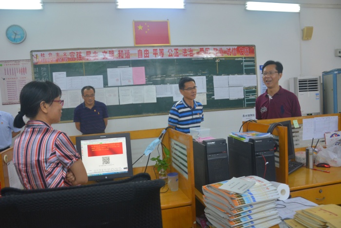 李副鎮(zhèn)長一行首先在該校梁炳華校長的陪同下,檢查了沙欄中學(xué)校園環(huán)境、操場配置、建筑用地等情況。接著,又走訪了校園的各個角落,了解該校校園文化建設(shè)情況。他們走進教室,視導(dǎo)老師們上課情況,感受該校學(xué)生濃厚的學(xué)習(xí)氛圍;深入教室辦公室,與教師們親切交談,鼓勵老師們勤勉工作,爭取在明年的中考中取得更好的成績;領(lǐng)導(dǎo)們還深入教導(dǎo)處,了解該校教育教學(xué)科研情況,鼓勵大家“多找問題、多想辦法”,用科研引領(lǐng)學(xué)校發(fā)展。
