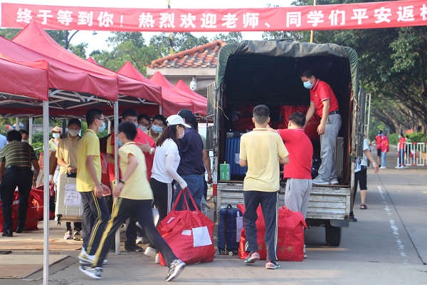 第二批返校復課學生三千余人,全部按計劃分批錯峰返校。初中兩個年級分上下午在學校正門、西門、側門、后門四個入口分班錯峰返校。每一個班級學生所對應的返校通道、返校時間段及其他各項要求已提前通過給家長發(fā)布的《告家長書》逐一傳達到每一位學生及其家長,真正做到錯峰、分時、分散返校。為了讓家長無后顧之憂,將學生送到校門口立刻安心離校,學校還組織了部分管理人員、初中教師、生活老師、后勤人員以及部分學生作為志愿者,在各個入口幫助返校學生卸行李、搬行李,引導學生檢測體溫等,完成好學生平安復課的每一道安全關卡。