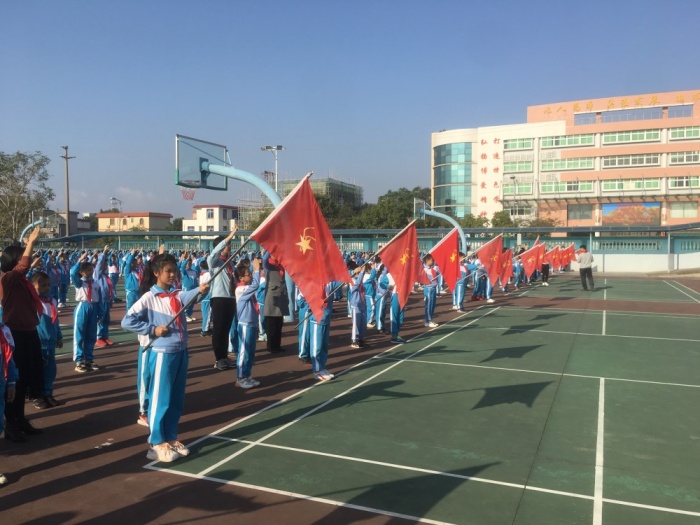 緊接著由陳苕校長、林良友主任和學生代表,帶領學生們宣布開啟“紅領巾爭章啟動儀式”。
