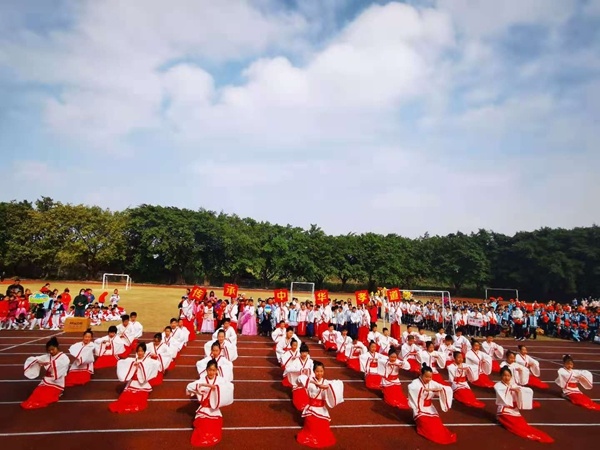 12月3日早上,運動會開始了,孩子們來到操場,歡欣鼓舞,因為他們將要在入場式上展示近一個月的訓(xùn)練成果。各班排著整齊的隊伍,個個精神抖擻,摩拳擦掌。果然,精彩的入場式表演,點燃了整個運動場,迎來各班同學(xué)和家長義工熱烈的掌聲。這次入場式特色鮮明,隆都文化、中華文化元素出現(xiàn)在每一場表演中,舞獅舞龍、隆都鶴舞、沙溪美食、民間武術(shù)、古詩吟誦,讓人耳目一新。在古琴古箏、鑼鼓陣陣的傳統(tǒng)音樂聲中,觀眾似乎穿越到了古代,領(lǐng)略到了古代勞動人民的智慧和勤勞,讓人忍不住為燦爛的中華文化拍手叫絕。喜慶的舞獅子、仙氣飄飄的鶴舞、感人至深的孝道舞、有板有眼的武術(shù),充分展現(xiàn)了中國人的溫良恭儉讓和頂天立地的精神,展示了中國人眼中的美好世界,孩子們在一招一式、一舉一動中受到了最好的傳統(tǒng)文化教育。這次入場式不僅是一次精彩的表演,更像是一場傳統(tǒng)服飾秀,儒雅的漢服、端莊的唐裝、各少數(shù)民族特色服裝,加上紙傘、扇子、彩帶等各種道具,讓人賞心悅目,回味無窮。