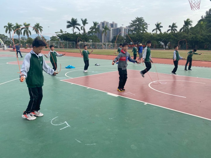 籃球場(chǎng)則是1分鐘跳繩的測(cè)試場(chǎng)地。在裁判的一聲令下前,同學(xué)們蓄勢(shì)待發(fā)??炜?!場(chǎng)上的同學(xué)們激情飛揚(yáng),飛快的繩子跟著他們輕盈的身子擺動(dòng),手中的跳繩在空中舞出一條美麗的弧線。每個(gè)同學(xué)都竭盡所能,測(cè)出自己,測(cè)出風(fēng)采。