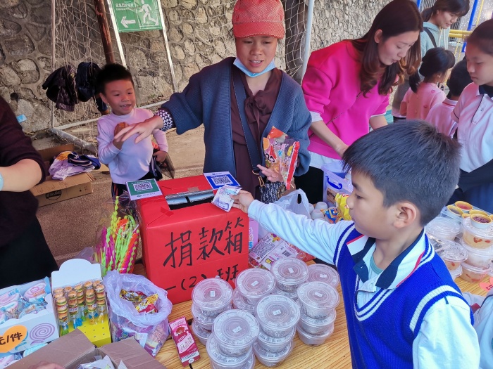在各班家委和班主任老師的配合下,在攤位上擺放好書籍、玩具等物品進行義賣。所有義賣的物品全部由學生自己提供,自己擔任愛心大使去義賣。下午,伴隨著《讓愛傳出去》 音樂主旋律,愛心義賣活動正式開始。琳瑯滿目的商品吸引了孩子們的目光,有的在同學的陪伴下,有的在家長的陪同下,到攤位上購買自己喜歡的物品。偌大的操場變成了一個大賣場,學生們以班級為單位分成了各個小“賣場”,每個攤位各具特色,有自己的攤位文化,同學們有的擔任售貨員、有的擔任推銷員。
