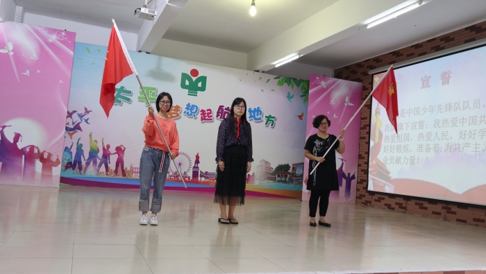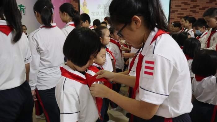 接著是新隊員入隊儀式。六年級的哥哥姐姐們給新隊員授予少先隊標志,幫助新隊員戴上鮮艷的紅領(lǐng)巾。大隊輔導(dǎo)員余鳳華老師帶領(lǐng)新隊員宣誓。每個新隊員都莊嚴宣誓,眼中熠熠發(fā)光,滿懷對少年先鋒隊的向往與期待。