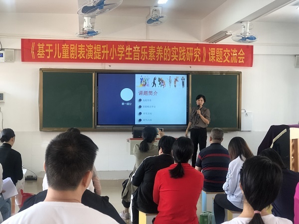 在課題交流分享中,課題主持人鄧娟主任首先從課題的選題背景、概念的界定、研究目標、研究內(nèi)容等方面向與會老師們進行了介紹;接著對課題研究兩年以來的情況也進行了詳細的闡述:1、開展問卷調(diào)查、撰寫調(diào)查報告;2、開設(shè)兒童劇表演社團,建立多元化方式;3、打造音樂素養(yǎng)精品課程,提高音樂教學(xué)質(zhì)量;4、開發(fā)區(qū)級小課題;5、研討交流,共同成長;6、研讀專著教材、整理校本課程資源;7、舉行系列校園兒童劇表演活動;8、課題組成員在研究過程中所獲得的系列成果展示等。最后,鄧娟主任對課題進行下一階段的努力方向進行了展望。最讓老師們覺得受益匪淺的是,她還講解到兒童劇表演如何走向音樂常規(guī)課堂:課前入戲——語言引導(dǎo)——劇情安排——情景教學(xué)。這幾個教學(xué)環(huán)節(jié)使大家耳目一新,起到了傳經(jīng)、授教、解惑的作用。