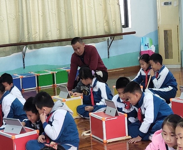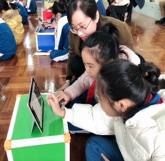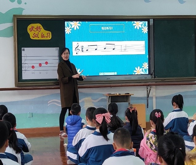 首先由石岐中心小學(xué)大信學(xué)校謝華老師帶來四年級豎笛旋律創(chuàng)編課《吹好sol la si》。謝老師重點(diǎn)教授豎笛sol la si的吹奏指法。她通過三條節(jié)奏練習(xí)讓學(xué)生熟悉sol la si三個(gè)音的指法,隨后用“師問生答”的方式引導(dǎo)學(xué)生進(jìn)行旋律創(chuàng)編,鞏固了學(xué)生對sol la si三個(gè)音的指法掌握,最后學(xué)生兩人一組在平板設(shè)備上通過西貝柳斯軟件用sol la si三音進(jìn)行旋律創(chuàng)編并展示。謝老師教學(xué)設(shè)計(jì)新穎獨(dú)特,在傳統(tǒng)課堂的基礎(chǔ)上加入了數(shù)字化信息設(shè)備,各個(gè)環(huán)節(jié)環(huán)環(huán)相扣,層層深入,為大家?guī)砹艘还?jié)豎笛與創(chuàng)編相結(jié)合的優(yōu)質(zhì)課。謝老師這一節(jié)音樂課又“新”又“潮”,華師附小的老師直言讓人大開眼界,令人稱奇。