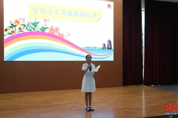 典禮的第三部分,由學(xué)校少先隊(duì)大隊(duì)委發(fā)出假期倡議書,倡議同學(xué)們?cè)诩倨谥?,積極參加垃圾分類,小手拉大手,親子共讀及研學(xué)等一系列活動(dòng)。書是人類進(jìn)步的階梯,她倡議同學(xué)們明禮守法、強(qiáng)身健體、品讀經(jīng)典。大隊(duì)部的倡議與法制安全講座相輔相成,同學(xué)們也更加明確了如何度過(guò)一個(gè)充實(shí)而有意義的暑假。
