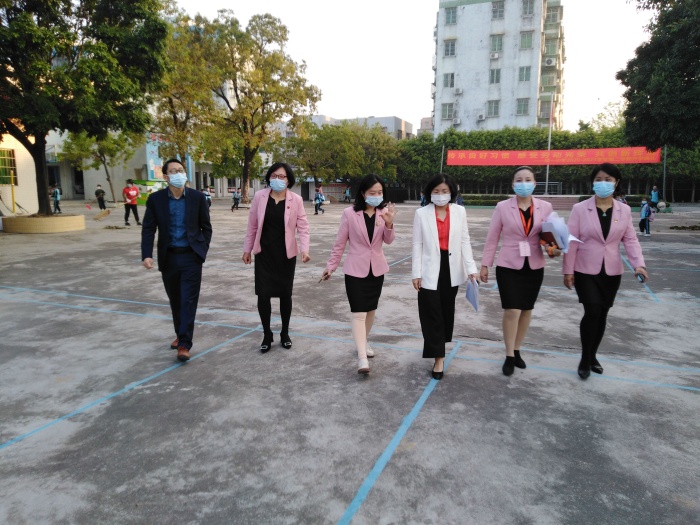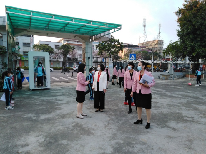 在坦洲鎮(zhèn)教育和體育事務(wù)中心張志略主任的陪同下,坦洲鎮(zhèn)黨委委員溫曉虹7時10分就來到了聯(lián)一小學(xué)了解開學(xué)情況并就開學(xué)各項(xiàng)工作作指導(dǎo)。校長潘虹、副校長陳麗娥、德育主任甘群帶、總務(wù)主任白雪梅和辦公室主任肖素華陪同一起巡視校園。