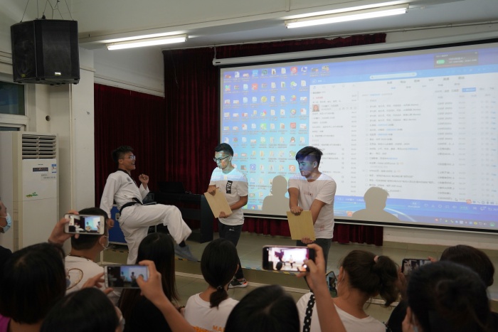 藝體處美貌與智慧并存的楊帆主任也不甘示弱,給一年級家長們介紹了藝體處的校本課程。當(dāng)英姿颯爽的跆拳道老師上場展示絕活兒時,現(xiàn)場家長們紛紛掏出手機(jī),拍照、錄相、鼓掌、喝彩聲連綿不絕,經(jīng)久不息。