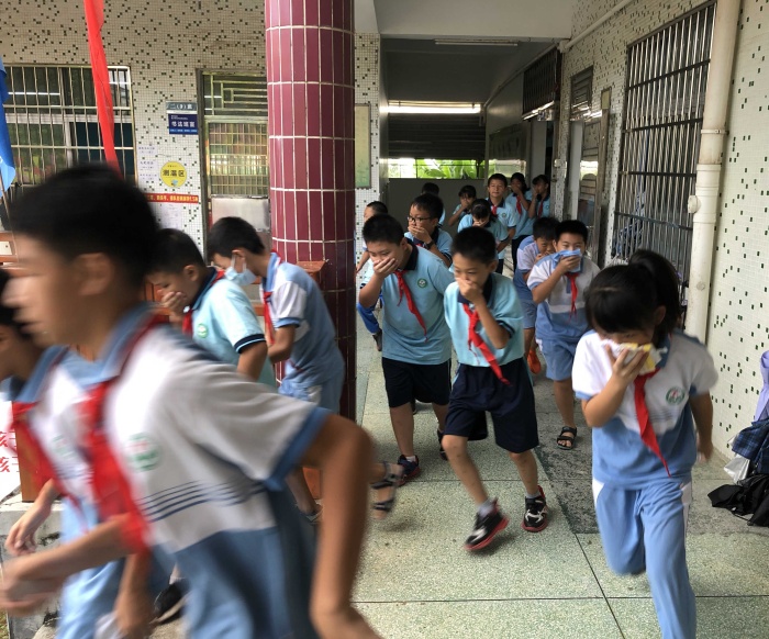 30日下午3點49分,隨著警報聲響起,各班班主任和科任教師及時準(zhǔn)確地組織學(xué)生,迅速進(jìn)入緊急疏散狀態(tài)。在老師的帶領(lǐng)下,全體學(xué)生彎著腰、貓著步,用手帕、毛巾等捂住口鼻,沿著學(xué)校指定樓梯口快速前進(jìn)。近600多名師生訓(xùn)練有素地從各個室場撤離到學(xué)校小操場空地,僅耗時1分20秒。隨后各班班主任清點人數(shù),匯報給學(xué)校安全主任。能如此快速有序地撤離,得益于安阜小學(xué)平時對安全工作的重視,師生們在疏散時牢記注意事項與撤離路線。