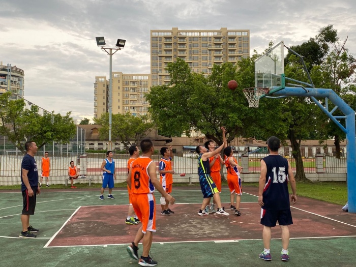 男老師們的籃球比賽也非常激烈,安阜小學(xué)的男老師們統(tǒng)一穿上橙紅色的球服,投球、運球間儼然一個個小伙子。兩校的老師難得在一起出一身汗,釋放運動的熱情。