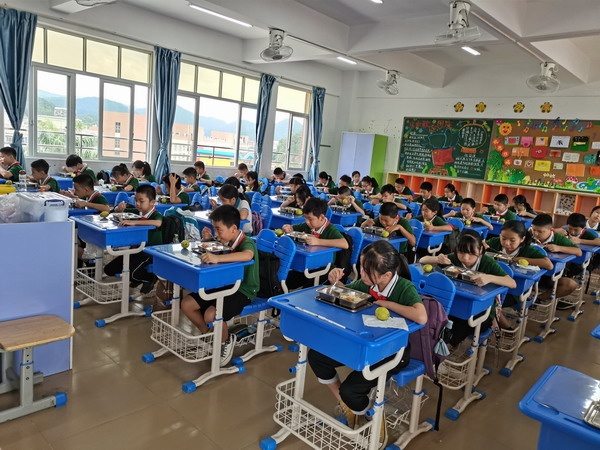 中午就餐時,飯?zhí)媒y(tǒng)一配餐送到教室。在老師的指揮下,孩子們自覺保持安全距離,午間就餐排隊距離1米以上,專人專坐,學生坐在自己的座位上文明用餐,避免了人員接觸。沒有了往日的三五成群、交頭接耳的情況,疫情防控意識已深深植根于每個孩子心中。