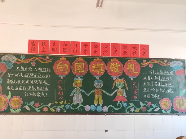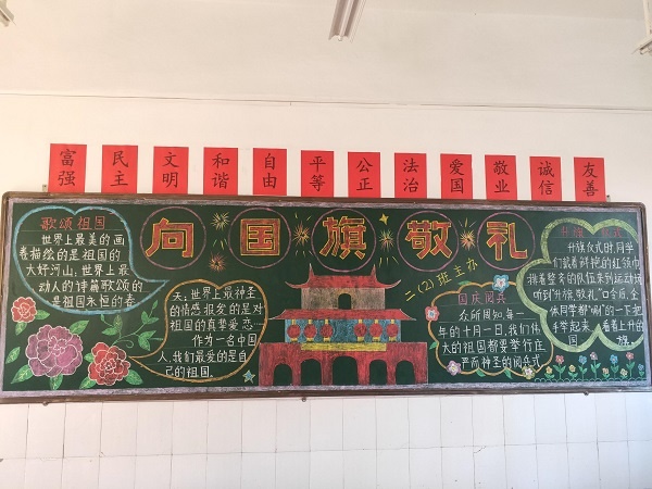 大隊(duì)部還組織了一次“向國旗敬禮”為主題的黑板報(bào)評(píng)比活動(dòng)。為了出好本次黑板報(bào),各班同學(xué)們團(tuán)結(jié)協(xié)作,懷著對(duì)祖國的熱愛,同學(xué)們充分發(fā)揮自己的聰明才智,設(shè)計(jì)出一幅幅畫面精美、布局合理、字體端正、內(nèi)容詳實(shí)、主題突出的黑板報(bào)。在這次活動(dòng)中,增強(qiáng)了同學(xué)們的愛國主義情懷。