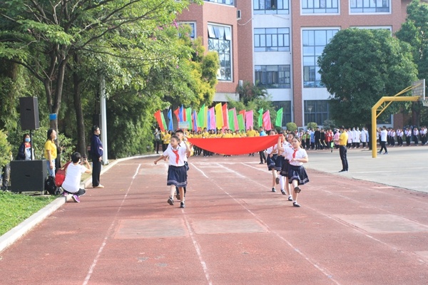大會開始前,體育科組全體總動員對比賽場地進(jìn)行精心布置,每個班都全身心投入開幕式節(jié)目,別開生面、創(chuàng)意無限的入場式,各班將抗疫精神融入表演當(dāng)中,充分展示了升平師生的風(fēng)采和作為中國人的自豪。五星紅旗伴隨著國歌隨風(fēng)飄揚,冉冉升起,在學(xué)生運動員代表和老師裁判代表宣誓后,何德雄校長隆重宣布“2020年升平小學(xué)第十一屆‘家委杯’運動會開幕”,一瞬間點燃了所有學(xué)生心中的運動熱情。