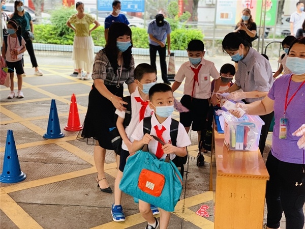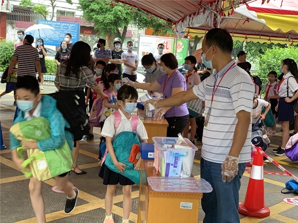 通往校園的河涌路上,孩子們按照學(xué)校制定的上學(xué)時間,實行錯峰上學(xué)。越靠近北區(qū)小學(xué)的遮雨棚,越看清排隊的孩子們一臉認真,聽從現(xiàn)場值日老師的引導(dǎo),快速進入校園!今天是一、二和三年級返校復(fù)課的第二天,經(jīng)過昨天的校園生活,低年級孩子們已經(jīng)了解上學(xué)的秩序,學(xué)校的行政班子依然不懈怠地早早在校門口做好迎接全校學(xué)生上學(xué)的準(zhǔn)備,即使是已經(jīng)熟悉的測量體溫工作,值日老師們都一絲不茍地對待,面對全校學(xué)生錯峰進入校園,壓力不可小視,這種認真對待的態(tài)度是北小一貫的常態(tài)!