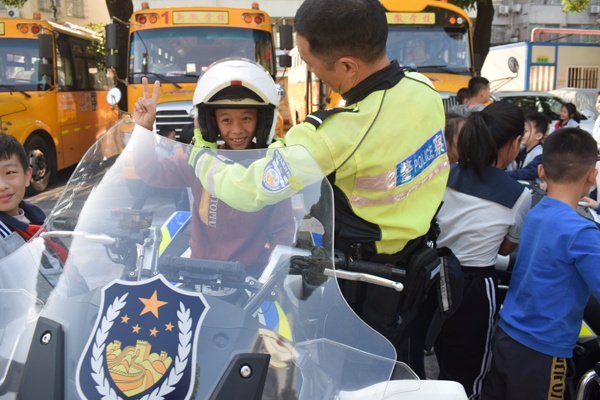 首先,交警大隊(duì)陳春易警官為同學(xué)們帶來(lái)了一堂生動(dòng)的交通安全教育課,在課堂上,陳警官?gòu)某鲂邪踩?、安全過(guò)馬路,乘坐合規(guī)合法車輛、遵守交通信號(hào)燈、不違反交通規(guī)則等方面對(duì)學(xué)生進(jìn)行了詳細(xì)的講解。交警大隊(duì)謝景世指導(dǎo)員也對(duì)同學(xué)們做了強(qiáng)調(diào)和要求,他希望同學(xué)們要認(rèn)真學(xué)習(xí)交通安全知識(shí),將遵守交通規(guī)則的宣傳帶回家,讓每個(gè)家長(zhǎng)都能加強(qiáng)交通安全意識(shí)。上完課后,接著進(jìn)行的是“小小交警活動(dòng)”,教同學(xué)們認(rèn)識(shí)、學(xué)習(xí)交通指揮手勢(shì)。交警鐵騎隊(duì)員為現(xiàn)場(chǎng)的同學(xué)們展示并帶領(lǐng)學(xué)習(xí)交通指揮手勢(shì),教同學(xué)們學(xué)習(xí)、認(rèn)識(shí)交通標(biāo)志,讓在場(chǎng)的同學(xué)們體驗(yàn)交警的工作職能,認(rèn)識(shí)并遵守各類交通指令。
