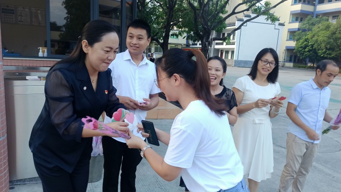 “三寸粉筆,三尺講臺(tái)系國(guó)運(yùn);一顆丹心,一生秉燭鑄民魂。”在第36個(gè)教師節(jié)到來(lái)之際,聚星學(xué)校舉行了形式新穎、內(nèi)容豐富的慶祝活動(dòng),為辛勤的老師們送上了一份誠(chéng)摯的祝福。一朵鮮花,一張校長(zhǎng)親手書寫的賀卡,……這些小小的禮物是聚星學(xué)校給每一位老師的最溫馨的祝福。教師節(jié)這天一大早,黨支部書記、校長(zhǎng)路海云,早已帶著幾位行政恭迎每位教師的到來(lái)。當(dāng)老師走到校門口的時(shí)候,校領(lǐng)導(dǎo)就把小禮品送到老師手上,并獻(xiàn)上最親切的祝福:“祝您教師節(jié)快樂(lè)!”,老師們欣喜地接過(guò)學(xué)校送來(lái)的祝福,臉上都洋溢著幸福的笑容。