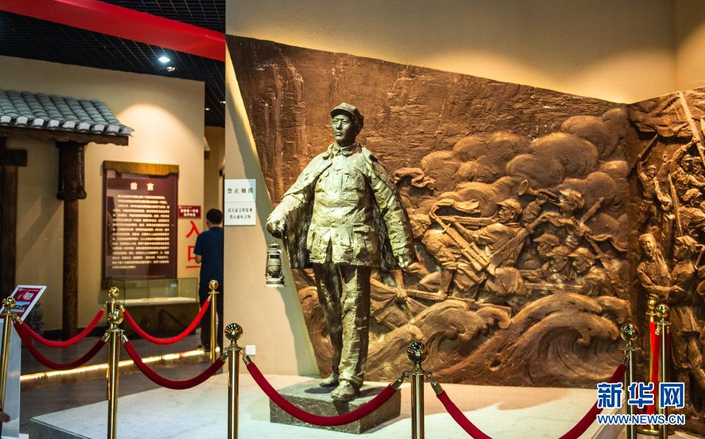 這是在茍壩會(huì)議陳列館拍攝的毛澤東身披外套、提著馬燈疾行的雕塑(2019年7月5日攝)。新華社記者 陶亮 攝