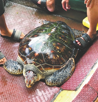 6月9日,中山市黃圃鎮(zhèn)馬安村內(nèi)河,一只31.5公斤重的海龜被廢棄漁網(wǎng)困住。熱心市民黃先生發(fā)現(xiàn)后,立即與其父駕駛船舶將海龜解救并打撈上船,并請(qǐng)求中山市海洋綜合執(zhí)法支隊(duì)予以救助。經(jīng)現(xiàn)場(chǎng)鑒定測(cè)量,該海龜為國(guó)家一級(jí)保護(hù)野生動(dòng)物綠海龜,體長(zhǎng)73厘米、寬52厘米,體重31.5公斤。目前,該海龜因發(fā)現(xiàn)及時(shí)施救得當(dāng)狀態(tài)良好,待它適應(yīng)野外生存條件后,將被中山海洋綜合執(zhí)法支隊(duì)護(hù)送放歸海洋。
