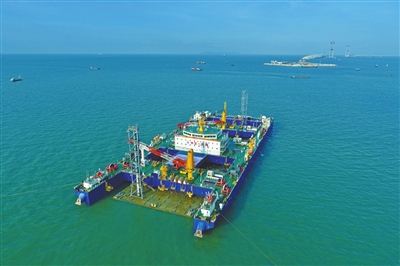6月18日下午2點20分,伴隨著渾厚的鳴笛聲,停泊在珠海桂山島塢口的世界首制沉管運輸安裝一體船提帶E10管節(jié)緩緩啟航。
