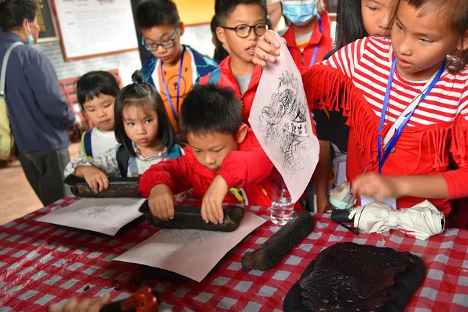 隨后,工作人員示范木版年畫的制作流程。只見,她左手輕壓住木版的一角,右手握住刷子蘸滿特制的顏料,將顏料慢慢沒過木版的線條,隨后快速將一張宣紙鋪于版上,用刷子均勻拓印,再使用雙手將宣紙掀開,魚躍龍門的形象頓時(shí)躍然紙上,引得小記者們紛紛排隊(duì)體驗(yàn)。