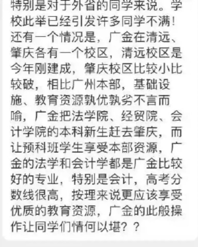 廣金在清遠(yuǎn)、肇慶都有1個校區(qū),清遠(yuǎn)校區(qū)今年才建成,相比廣州本部,清遠(yuǎn)基礎(chǔ)設(shè)施、教育資源還不能與本部相提并論,肇慶校區(qū)比較破。