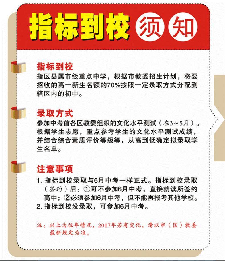 除此之外,還有一個(gè)實(shí)現(xiàn)教育資源合理分配的“新政策”――指標(biāo)到校。這個(gè)名稱很多人一定并不陌生,因?yàn)橛泻芏喑鞘性缭诤荛L(zhǎng)時(shí)間以前就開始實(shí)施了。但終歸是小范圍,不能惠及到所有的初中生。
