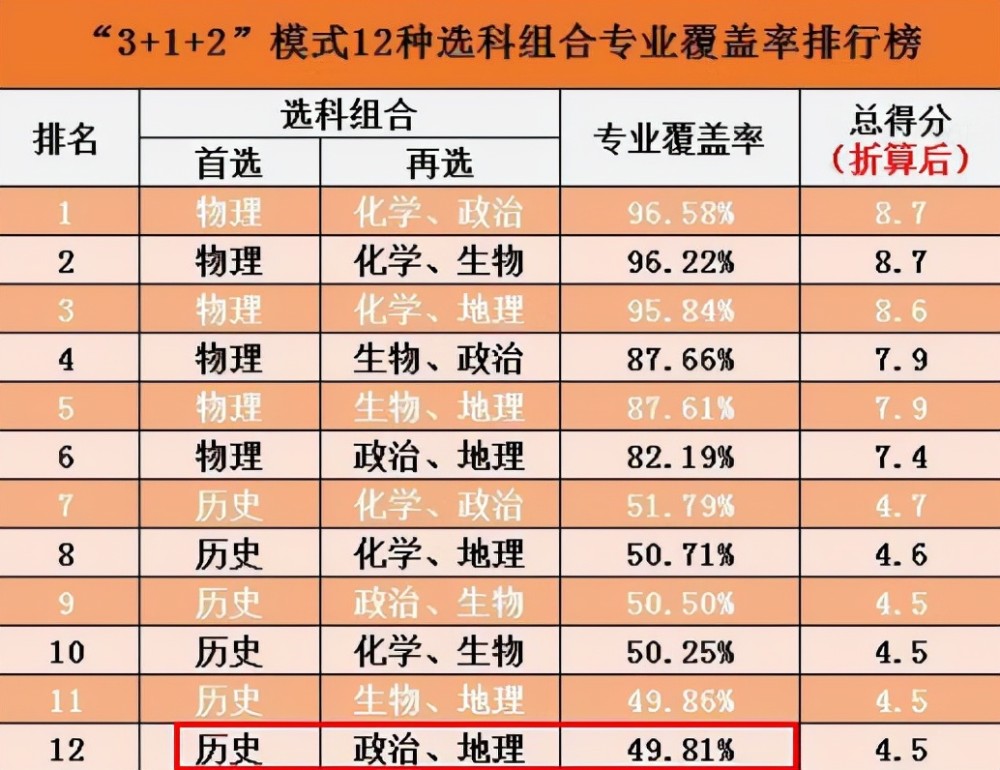 在12種選科組合有一種,是比較不被老師推薦的,那就是史政地的組合,史政地組合從專業(yè)覆蓋率來說就只有50%不到,也就是說選擇這組學(xué)科的學(xué)生,可能有一大半專業(yè)不能選擇,尤其是首選歷史就相當(dāng)于與放棄了理工類專業(yè)。