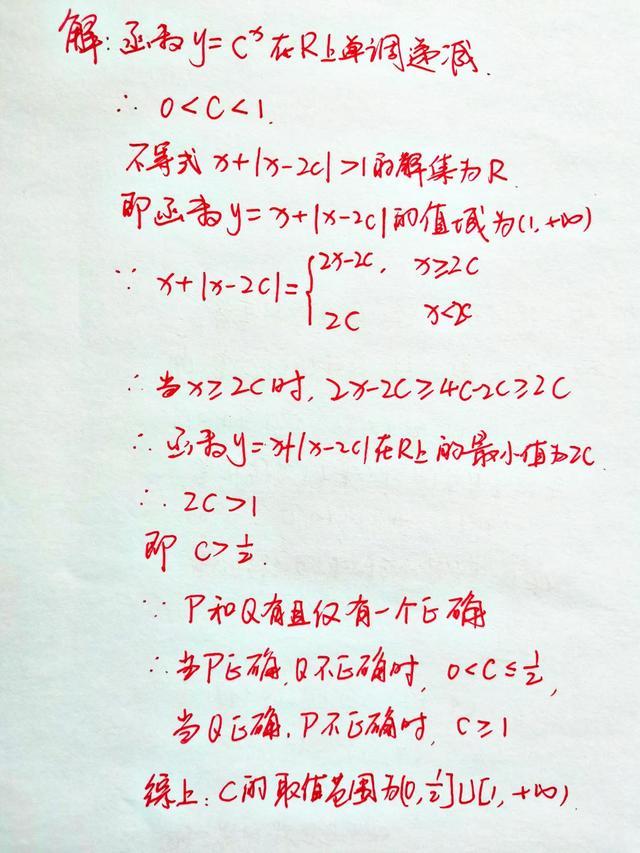 Q為真時,即不等式x+|x-2c|>1的解集為R,則等價于函數(shù)y=x+|x-2c|的值域為(1,+∞)。要求這個函數(shù)的值域,需要先去掉絕對值符號,即需要對x進行分類討論:當x≥2c時,y=2x-2c;當x<2c時,y=2c。又x≥2c時,y=2x-2c≥4c-2c=2c,所以函數(shù)y的最小值就是y=2c,則有2c>1,即c>1/2。