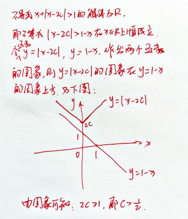 由x+|x-2c|>1得:|x-2c|>1-x,然后設(shè)構(gòu)造兩個函數(shù),y=|x-2c|和y=1-x,此時原不等式就轉(zhuǎn)化為兩個函數(shù)大小的比較。接下來先作出函數(shù)y=1-x的圖像,因為|x-2c|>1-x,即函數(shù)y=|x-2c|的圖像始終在函數(shù)y=1-x的圖像的上方,由此即可求出c的取值范圍。