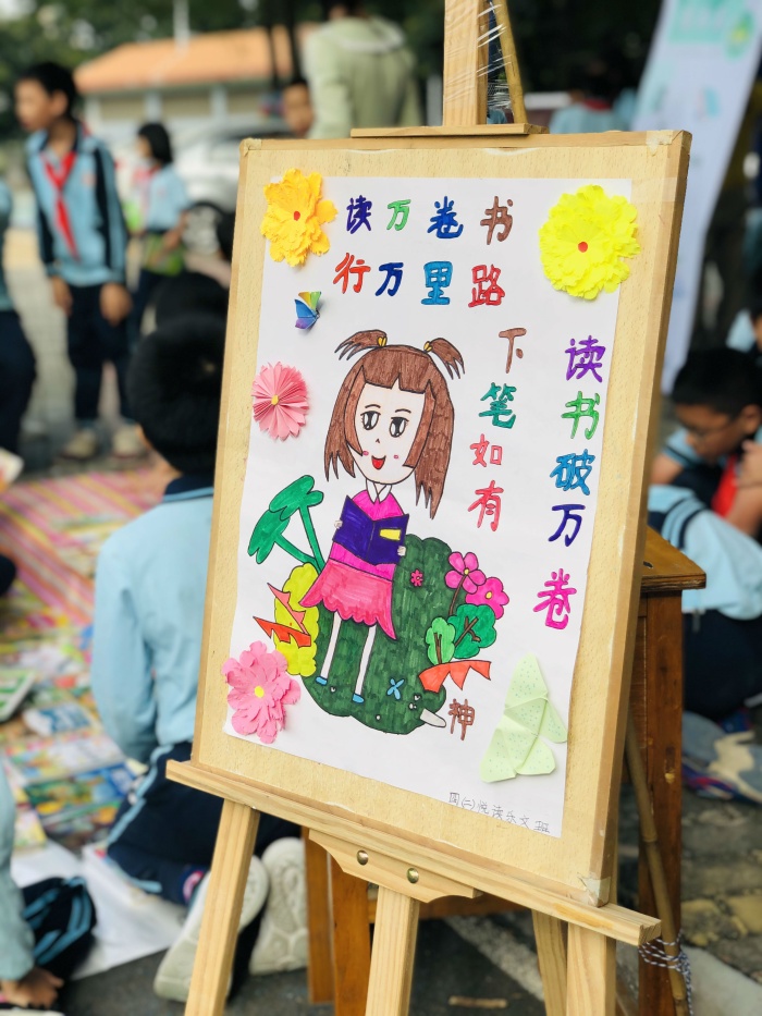 啟動儀式結(jié)束后,曬書活動正式開啟,全體師生以及班級家委的一齊參與讓整個校園沸騰起來。全校14個班級可謂八仙過海各顯神通,無論是曬書攤位的布置還是同學(xué)們以書換書的創(chuàng)意,都讓人大開眼界:三(3)班的 “瓶水齋”奪人眼球;四(1)班的 “淘書樂”精美別致,讓人耳目一新;四(3)班“會移動”的海報,真讓人拍手叫絕;五年級同學(xué)制作的各類精美海報,讓人嘖嘖贊嘆……還有各種換書抽獎,換書贈書簽等植入的小活動,把曬書活動推向了高潮,整個校園洋溢著歡聲笑語。一個小時的曬書活動接近尾聲,喧囂過后,整個校園又是一幅別樣的寧靜:換得心愛之書的孩子們不約而同,在校園的各個角落,席地而坐,手捧書籍,靜靜閱讀,閱讀的美好在這里悄然而生。