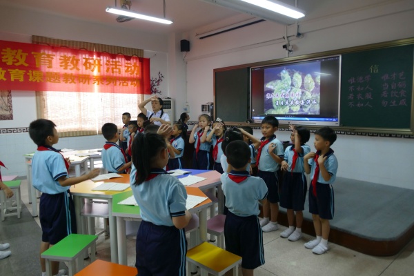 坦洲鎮(zhèn)同勝小學(xué)梁霞老師呈現(xiàn)了國學(xué)特色課程《弟子規(guī)節(jié)選<信>》。課堂的開始是梁霞老師帶領(lǐng)學(xué)生頂書靜坐,營造出寧靜祥和的課堂氛圍。新課的教授過程梁霞老師十分注重學(xué)生對弟子規(guī)內(nèi)容的理解,以多種形式讓學(xué)生交流討論并誦讀。課堂中隨班就讀學(xué)生不時地離開座位,干擾其他學(xué)生聽課,梁霞老師都是耐心十足地將其帶回座位,安撫好他的情緒。在此過程中,梁霞老師還以小組合作形式讓小組學(xué)生帶動隨班就讀學(xué)生進行學(xué)習(xí),其中手語舞蹈教學(xué)環(huán)節(jié)帶動了隨班就讀學(xué)生更好地融入課堂教學(xué),為隨班就讀學(xué)生提供了教學(xué)契機。整節(jié)課中,梁霞老師除了進行正常的教學(xué),還時刻關(guān)注著隨班就讀學(xué)生的情況,梁霞老師或是用手勢指導(dǎo)隨班就讀學(xué)生,或是利用教學(xué)的視頻吸引隨班就讀學(xué)生注意力,整節(jié)課隨班就讀學(xué)生也十分配合梁霞老師的教學(xué)指導(dǎo)。