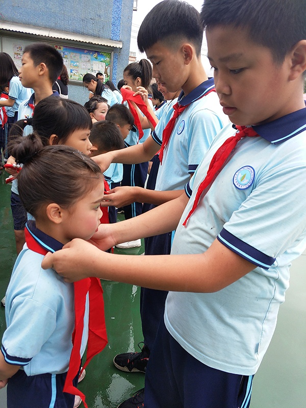 在此之前,大隊部向全校同學(xué)發(fā)出加入少先隊組織的號召。還未加入少先隊的同學(xué)們聽到消息后,都非常積極踴躍地表達(dá)了想要加入少先隊的強(qiáng)烈愿望。經(jīng)過個人申報、中隊輔導(dǎo)員推薦、大隊部審核,最終批準(zhǔn)了以一(1)班的葛玥辰為代表的40名同學(xué)加入少先隊組織。大隊部組織符合入隊條件的預(yù)備隊員們進(jìn)行隊前教育,并于5月31日上午“迎六·一”系列活動中,永一小學(xué)少先隊大隊部為新隊員舉行了莊嚴(yán)的入隊儀式。儀式上,老隊員為新隊員帶上鮮艷的紅領(lǐng)巾,新隊員們的心里充滿了無比的幸福與自豪。一(1)中隊的葛玥辰同學(xué)代表新隊員講話,她向大家保證新隊員們將更加熱愛學(xué)習(xí),關(guān)心集體,團(tuán)結(jié)同學(xué),努力爭做一名優(yōu)秀的少先隊員,為自己爭光、為少先隊爭光、為學(xué)校爭光!