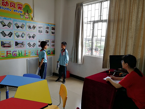 英語口語表達能力的培養(yǎng),是英語教學的一個重要內(nèi)容。坦洲鎮(zhèn)永一小學的英語老師非常重視對學生英語口語能力的培養(yǎng),積極開展《數(shù)字化環(huán)境下鄉(xiāng)鎮(zhèn)小學學生英語口語能力培養(yǎng)的研究》這一市級立項課題的研究。為了全面考核學生的口語表達能力,檢測課題開展的效果,5月15日上午,永一小學對參與課題研究的三到五年級的學生開展“英語口語能力測評活動”。